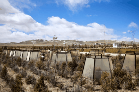 这是2026年3月18日拍摄的用于保护树苗的顶开式滤光温室和PE树围。新华社记者 周昱龙 摄