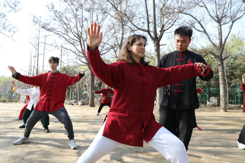 3月18日,外籍太极拳习练者在陈家沟村内练拳。新华社记者 任卓如 摄
