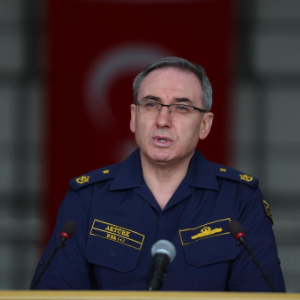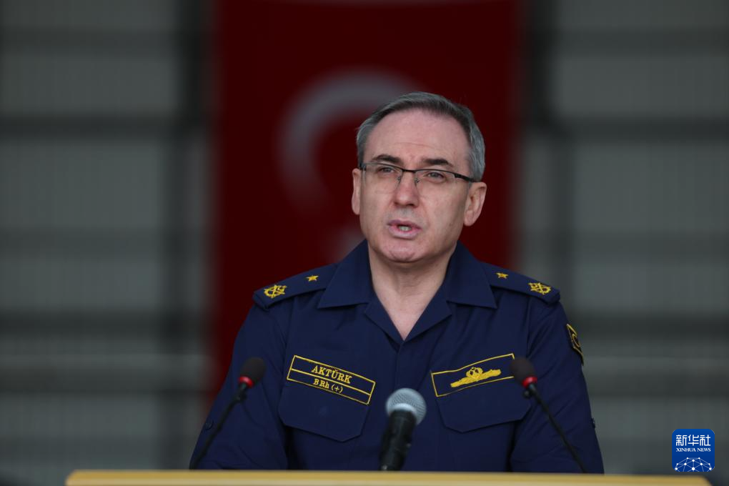 3月18日,土耳其国防部发言人泽基·阿克蒂尔克在位于该国东南部阿达纳省的因吉尔利克空军基地举行的记者会上讲话。
