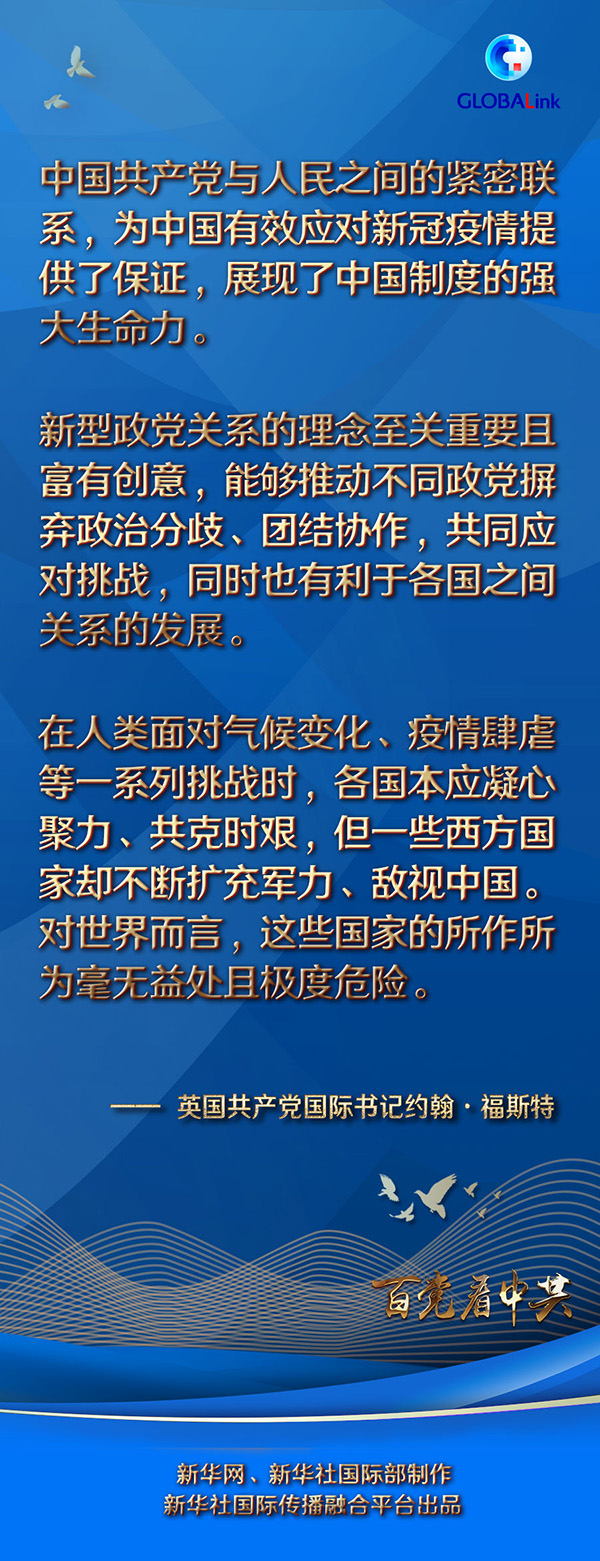 福斯特表示,作為一個領(lǐng)導著世界上人口最多國家的百年大黨,中共倡導建立新型政黨關(guān)系和構(gòu)建人類命運共同體,對促進世界的和平與發(fā)展具有重要意義。