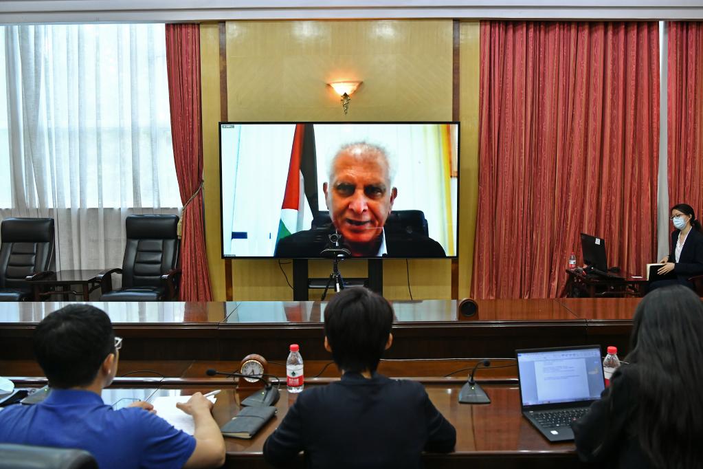 5月27日,巴勒斯坦人民黨總書(shū)記巴薩姆·薩利希通過(guò)視頻連線接受記者采訪。新華社記者李鑫攝
