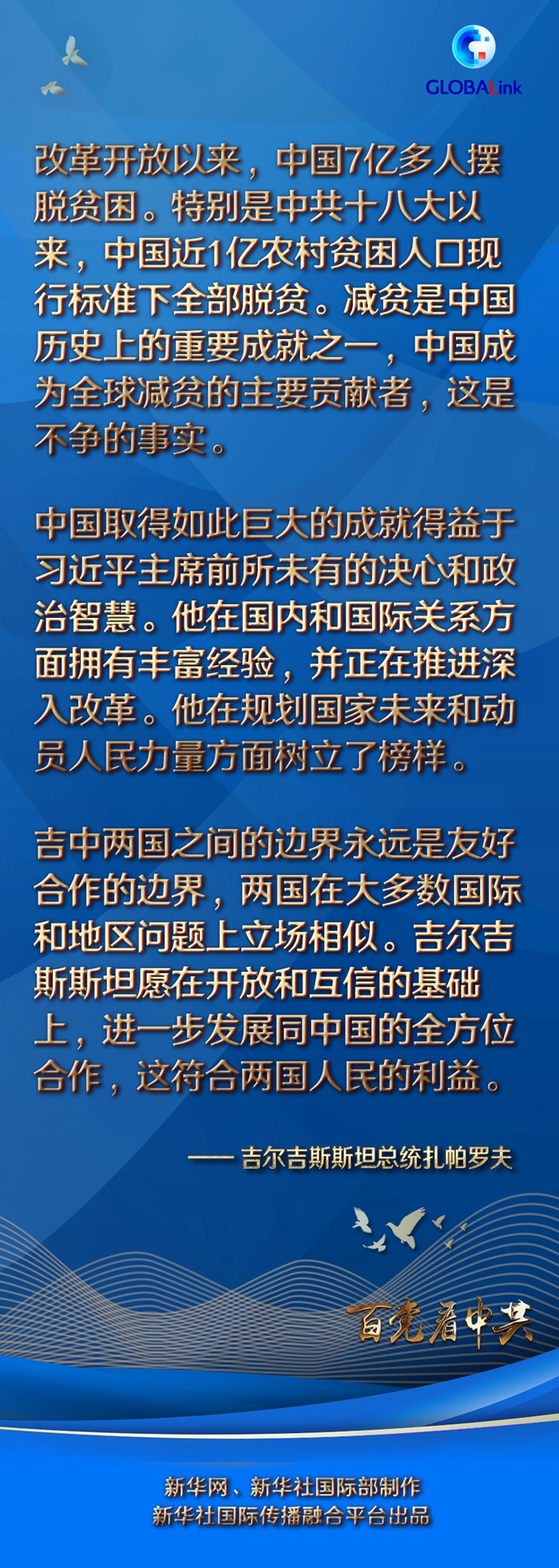 扎帕羅夫特別提到中國的減貧成就。他說,改革開放以來,中國7億多人擺脫貧困。特別是中共十八大以來,中國近1億農(nóng)村貧困人口現(xiàn)行標準下全部脫貧?!皽p貧是中國歷史上的重要成就之一,中國成為全球減貧的主要貢獻者,這是不爭的事實。”